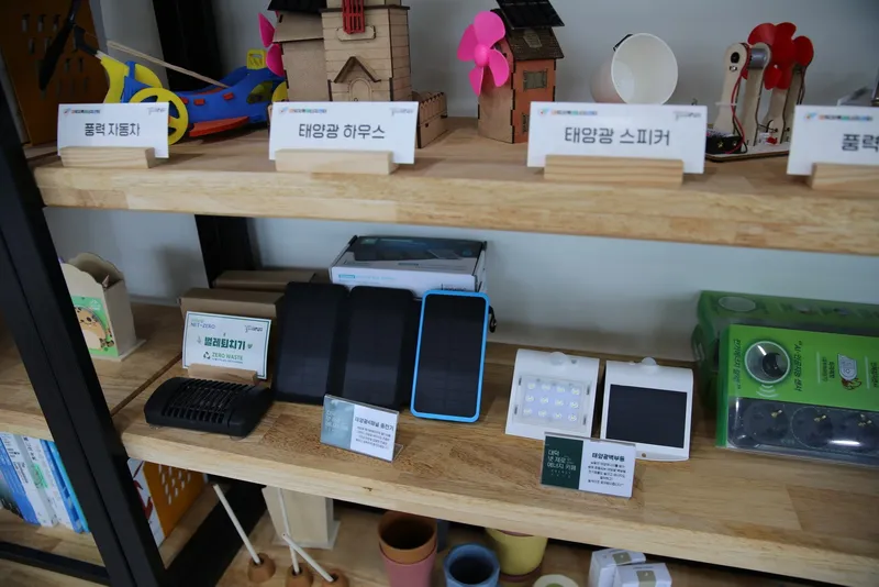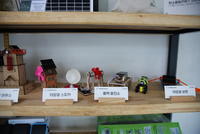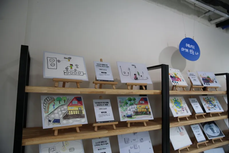 가장 대중적인 신재생에너지인 태양광 발전은 태양의 빛 에너지를 태양 전지라는 광전 변환기를 써서 직접 전기 에너지로 변환시켜 이용하게 됩니다. 아이들의 참여를 통해 에너지가 어떤 식으로 다가올지에 대한 작품들이 이곳에 놓여 있습니다.