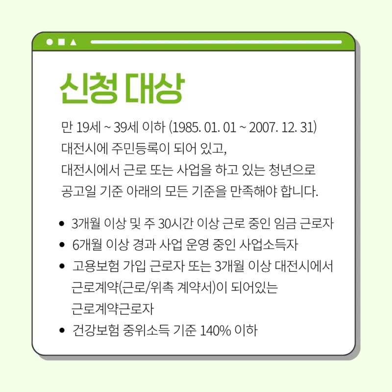신청대상은 공고일 기준 18세 이상 39세 이하의 주민등록상 주소지가 대전시이면서 대전에서 근로 또는 사업을 운영 중인 건강보험료 중위소득 140% 이하의 청년입니다.