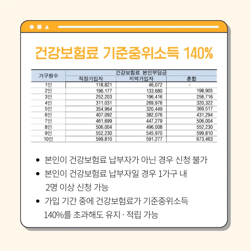 본인이 건강보험료 납부자인 경우에만 신청이 가능하고, 동일 가구여도 건강보험료가 분리되어 있으면 2명 이상도 신청할 수 있습니다. 또한 사업 참여 기간 동안 급여가 올라 건강보험료가 상승하여 중위소득 140%를 넘어서더라도 통장은 유지되어 계속 적립할 수 있습니다.