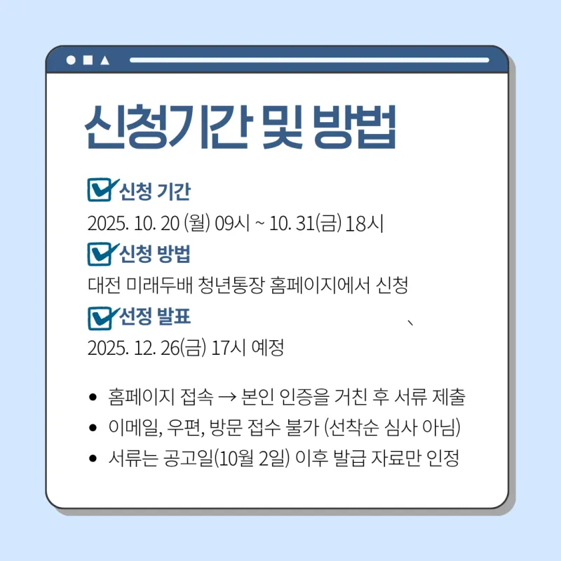 신청은 미래두배 청년통장 홈페이지(https://youthaccount.or.kr)에서 온라인으로만 가능합니다. 이메일이나 우편, 방문 접수는 불가하며, 첨부 서류는 10월 2일 이후 발급한 자료만 인정됩니다. 선정 기준은 소득(64%)+거주(18%)+연령(18%)으로 평가되고 동점자의 경우에는 소득 낮은 순 → 거주 기간 오래된 순 → 연령 높은 순으로 선정됩니다.