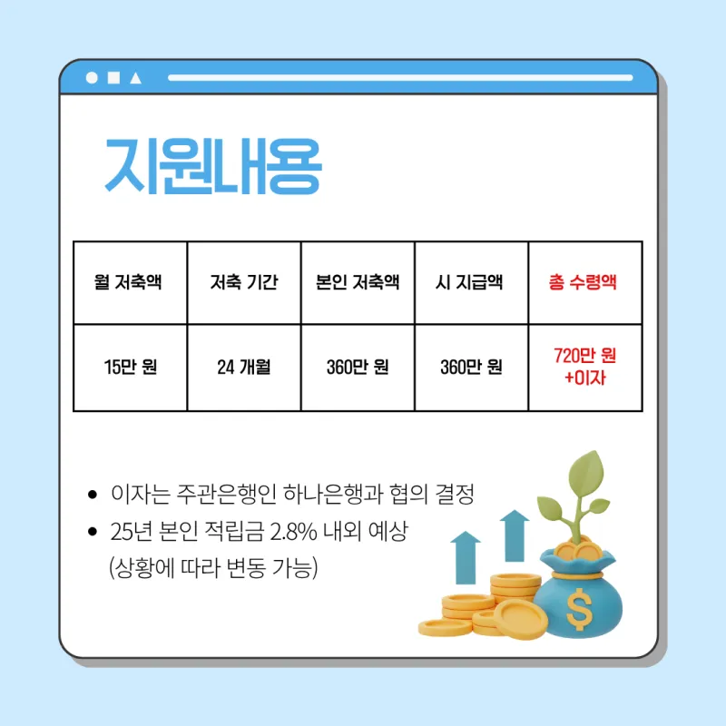최종 지원자로 선정되면 약정 체결 후 본인이 직접 하나은행을 방문해 통장을 개설하고 2년 동안 정해진 조건을 이행해야 자격이 유지됩니다.