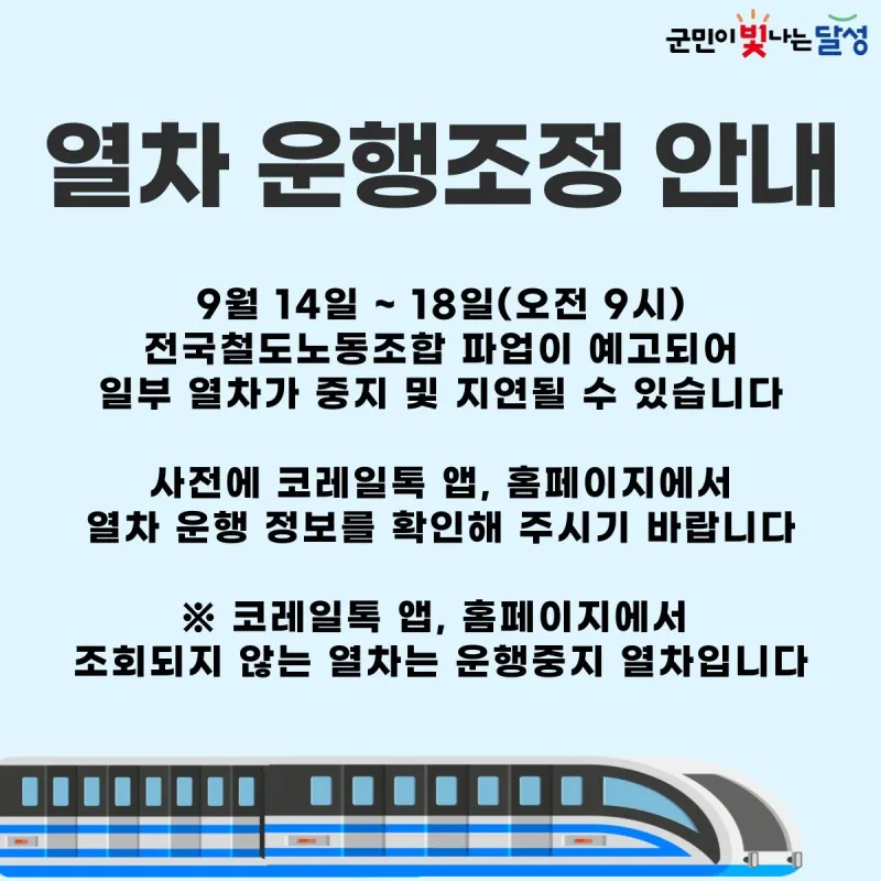 9월 14일(오전 9시) ~ 18일(오전 9시) 전국철도노동조합 파업이 예고되어 일부 열차가 중지 및 지연될 수 있습니다
