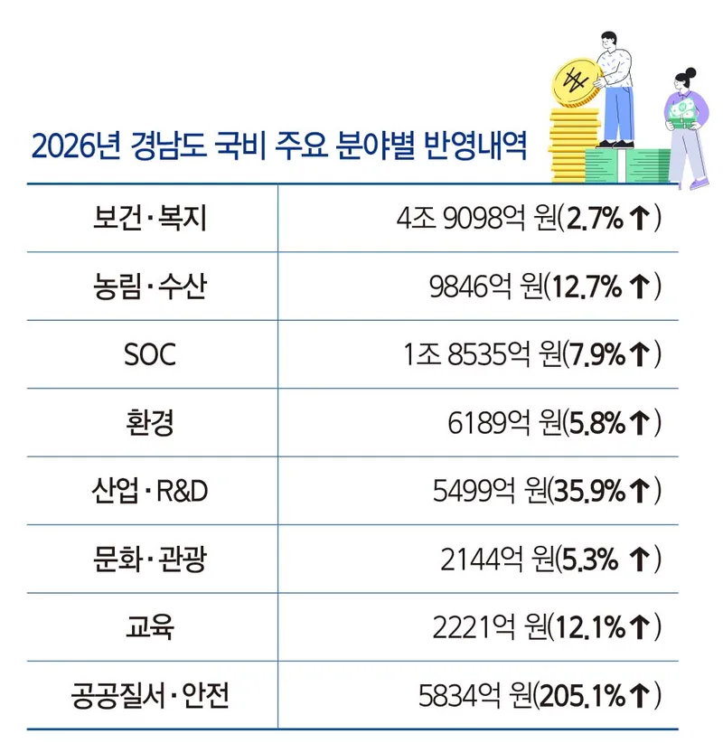 경남도는 2023년 8조 7157억 원, 2024년 9조 4079억 원, 2025년 9조 6082억 원에 이어 2026년 11조 1418억 원으로 사상 최초로 10조 원대 국비 예산 시대에 들어섰다. 역대 최고액 반영이라는 쾌거와 함께 인공지능(AI)·연구개발(RD), 주력산업 고도화 등 정부의 중점투자 방향과 연계성을 강화한 점, 신속한 일상 복귀 지원을 위해 재해·재난 복구비가 확대 반영된 점이 눈에 띈다. 2026년도 국비 정부예산 반영 내역은 미래성장을 위한 투자와 주력산업 육성을 통해 경남을 대한민국 산업·경제 중심지로 만들고, 균형성장과 따뜻한 민생안정을 추구함으로써 ‘도민행복시대’를 정착시키기 위한 사업들로 구성됐다.