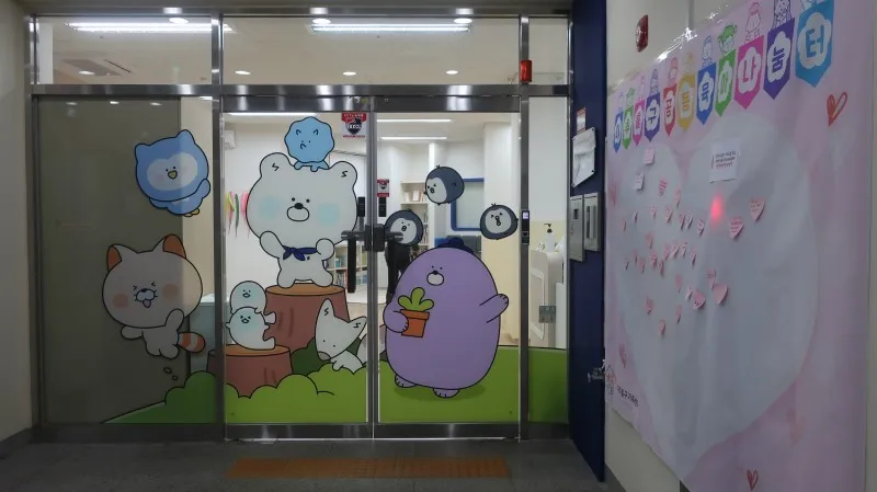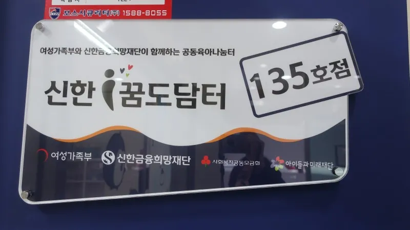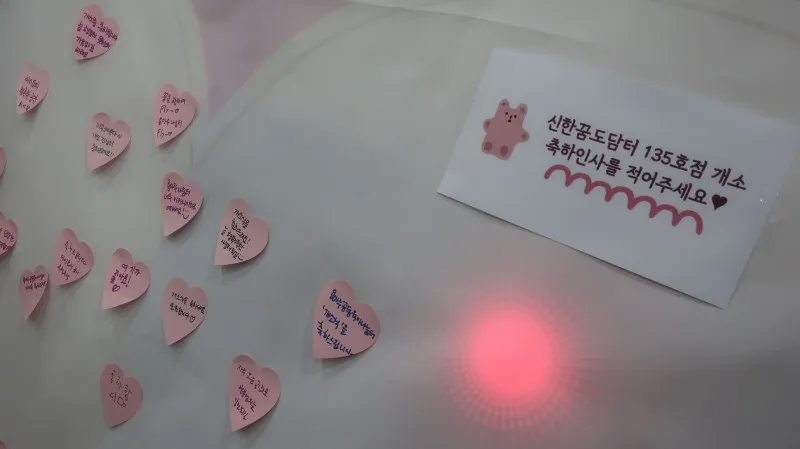 입구에는 귀여운 캐릭터들이 반갑게 맞이해주고 있고, 옆쪽 벽면에는 신한꿈도담터 135호점을 개소한 것에 대한 축하 인사 포스트잇이 줄지어서 있어요. 저희가 적었던 인사말이 있어 더 반가웠습니다.