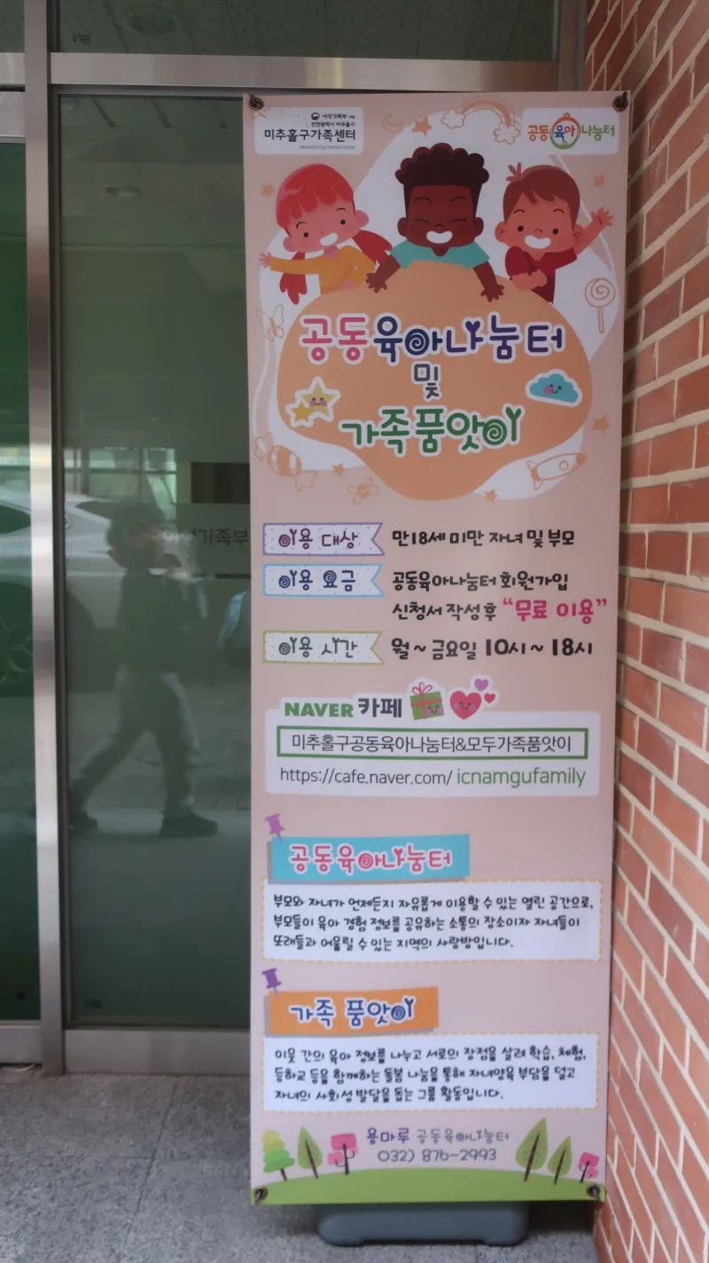 공동육아나눔터로 12개월 미만의 아기들도 올 수밖에 없는 공간이다 보니 여러 가지 편의 시설들이 잘 갖추어져 있어 좋았습니다. 화장실은 밖에 바로 있어 동선이 길지 않으며, 주차 공간은 LH미추홀 3단지 아파트 단지 내 하시면 되고, 가족센터를 방문하신다고 하면 무료로 이용을 하실 수 있답니다.