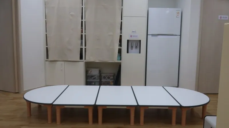 신발을 벗고 들어갈 수 있는 바닥이라 어린 아기들도 내려놓을 수 있고, 테이블과 정수기, 냉장고도 있습니다. 종이컵과 마실 차, 커피믹스가 준비가 되어 있어 엄마들에게 잠깐의 휴식을 줄 수 있는 공간입니다.