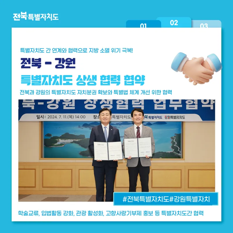 전북과 강원은 앞으로 특별자치도 자치분권 확보와 특별법 체계 개선을 위한 학술교류, 입법활동 강화, 관광 활성화, 고향사랑기부제 홍보 등에 서로 협력하기로 했습니다.
