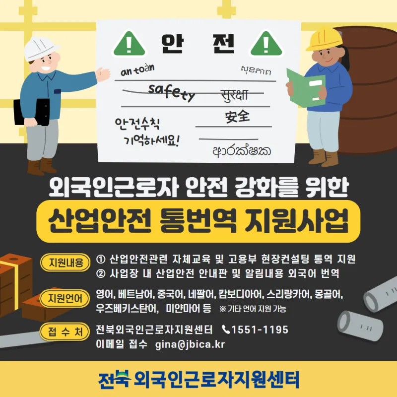 지원 언어로는 영어와 베트남어, 중국어, 네팔어, 캄보디아어, 미얀마어 등이며 추가적인 요청이 있을 경우 지원 가능 언어를 확대해 나갈 예정입니다. 외국인 근로자 현장 컨설팅 및 산업안전에 대한 통번역 지원 등은 전북외국인근로자지원센터를 통해 신청할 수 있습니다.