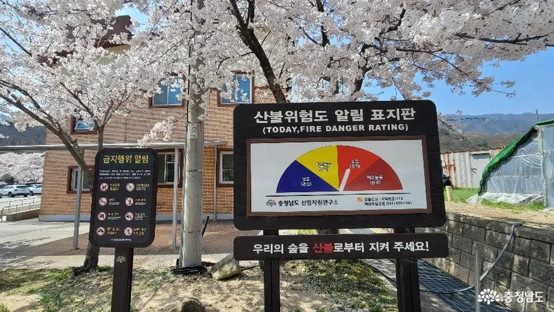 가야산 방향으로 가는 길에 산불 경계표시가 있는데, 주말에 비가 오기 전에는 최근 날씨가 건조했기 때문에 산불 위험도는 '높음(경계)'로 표시돼 있습니다.