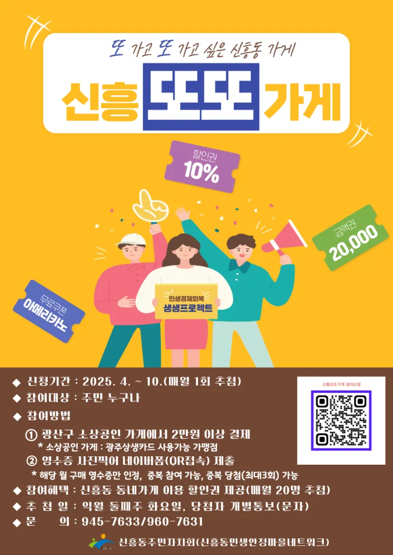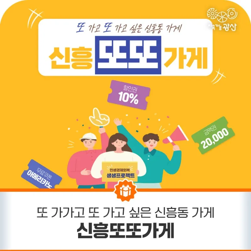 광산구 소상공인 가게에서 2만원 이상 이용하고 구매영수증을 제출하면 신흥동 소상공인 가게 이용 쿠폰을 매월 추첨을 통해 증정함