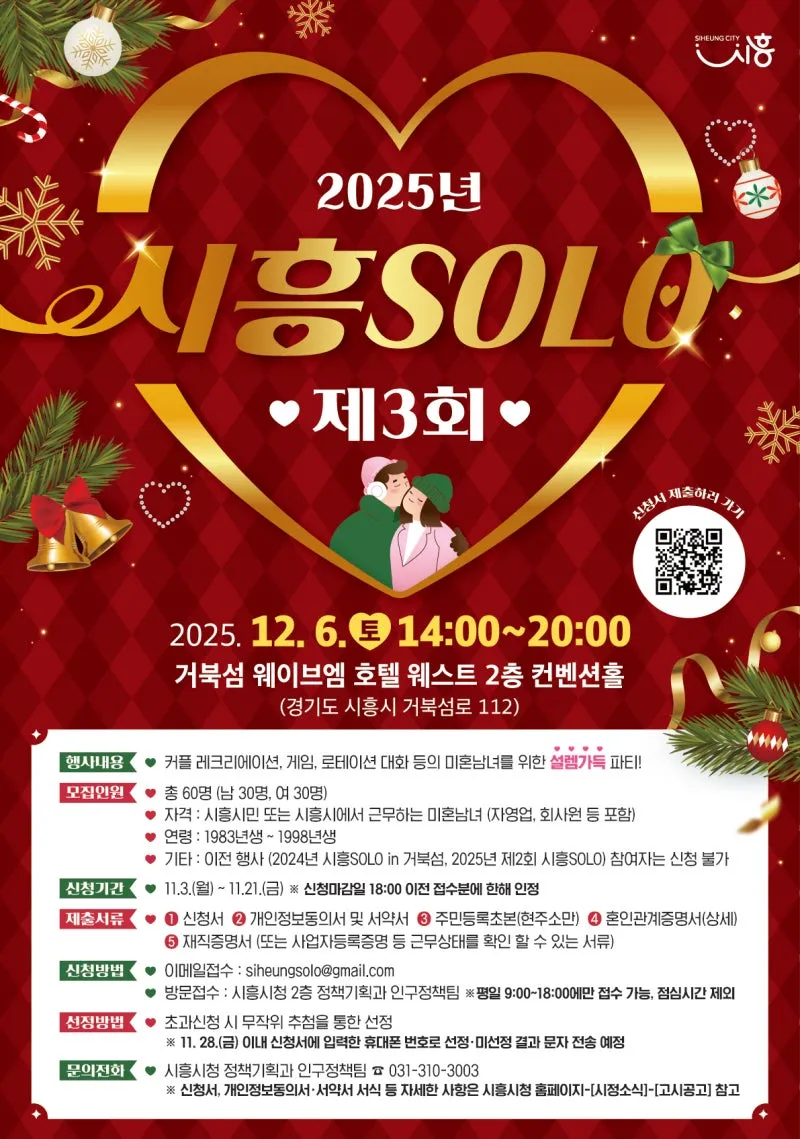 총 60명(남 30명, 여 30명) ☑️ 자격 : 시흥시민 또는 시흥시에서 근무 (자영업, 회사원 포함) 하는 미혼남녀 ☑️ 연령 : 1983 ~ 1998년 출생자 ( ⁕ 주민등록상 태어난 연도 기준 ) ☑️ 기타 : 이전행사 (2024년 시흥SOLO In 거북섬, 2025년 제2회 시흥SOLO) 참여자는 신청 불가 |