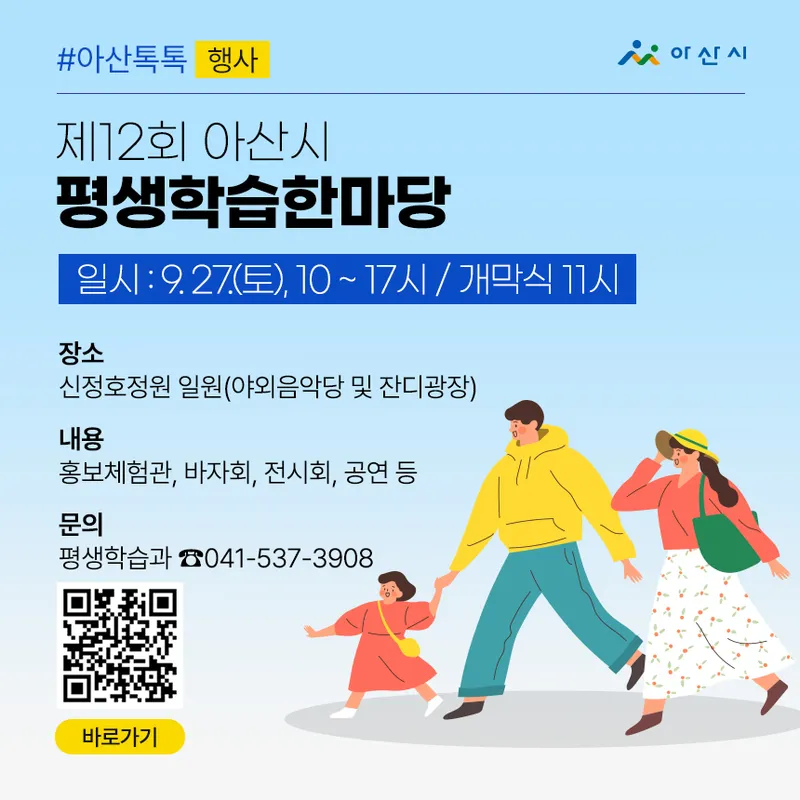 아산시에서는 지역주민의 평생학습 참여촉진과 평생학습문화 확산을 위해 아래와 같이 평생학습 관련 기관·단체·학습동아리가 함께 참여하는 제12회 『아산시 평생학습한마당』 축제를 개최하오니, 시민분들의 많은 참석을 바랍니다. - 행 사 명: 제12회 아산시 평생학습한마당 - 주 제: 배움으로 다시 뛰는 아산, 평생학습으로 여는 시민행복! - 일 시: 2025. 9. 27.(토) 10:00 ~ 17:00 ※ 개막식 : 2025. 9. 27.(토), 11:00, 신정호 야외음악당 - 장 소: 신정호정원 일원(야...