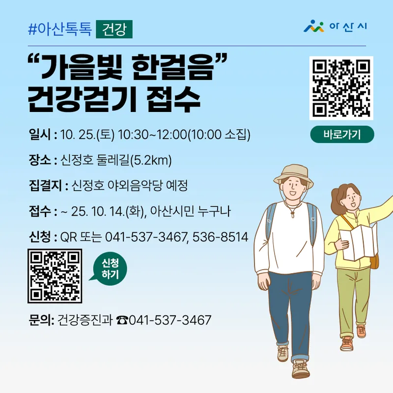 <"2025년 가을빛 한걸음 건강걷기" 사전 신청자 모집> 가. 일 시 : 2025. 10. 25.(토) 10:30~12:00 나. 장 소 : 신정호 둘레길 다. 대 상 : 아산시민 누구나 라. 주요내용 : "가을빛 한걸음" 건강걷기 - 신정호 둘레길 완주(5.2km) 마. 접수기간 : ~ 10월 14일(화) 바. 신청방법 : 네이버폼(카드뉴스 내 QR코드 접속 또는 https://naver.me/FNItI976 접속) 접수 또는 전화 접수(041-537-3467, 536-8514) 사. 혜 택 : 사전...