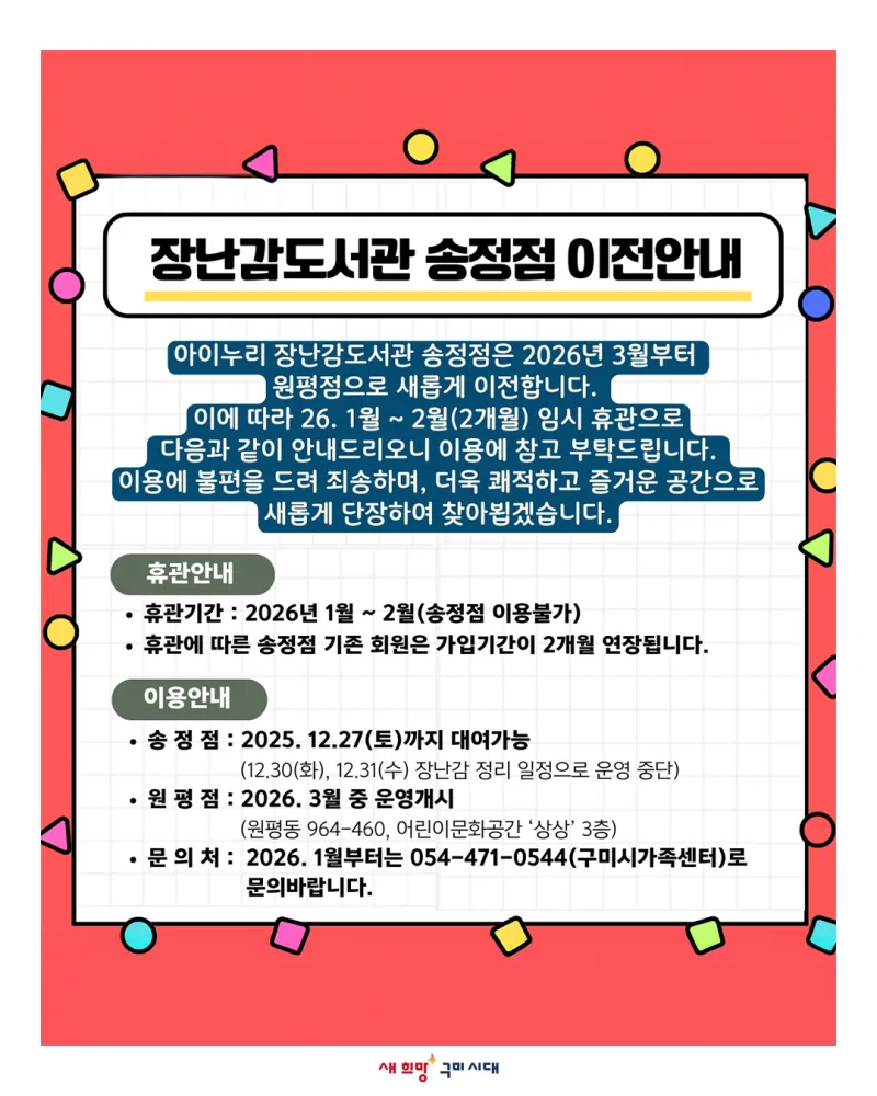 구미 아이누리 장난감도서관 송정점 이전 안내