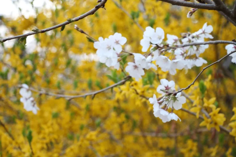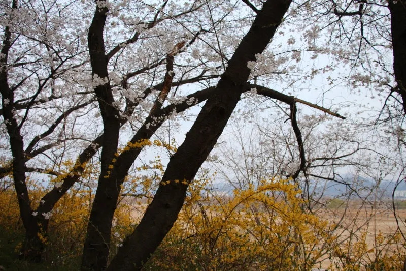 노란 개나리와 연분홍 벚꽃이 조화롭게 피어나있습니다.