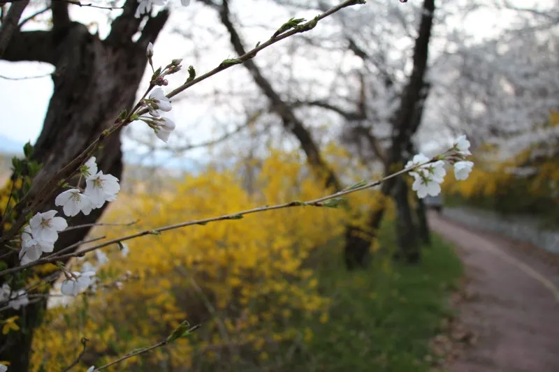 다산 행복누리길 맞은편 자전거길에 지금 봄의 전령사인 노오란 개나리와 벚꽃들이 피기 시작했어요~