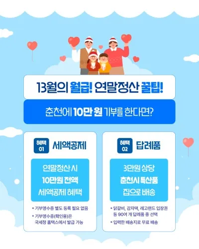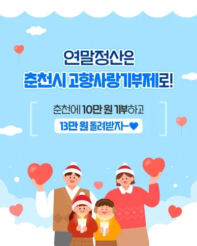 #춘천시청 #고향사랑기부제 #춘천고향사랑기부제 #연말정산꿀팁#세액공제 #연말정산준비 #춘천기부 #착한기부#춘천특산품 #답례품 #기부혜택 #춘천사랑#지속가능한도시 #춘천시민참여 #연말기부#고향사랑e음 #춘천정책 #연말정산이벤트 #기부문화 #춘천소식