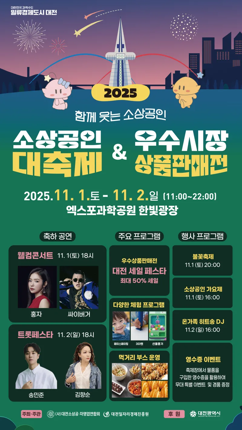 11월 1일(토)부터 2일(일)까지 엑스포과학공원 한빛광장 일원에서 '2025년 소상공인 대축제 & 우수시장 상품판매전'이 열립니다.
