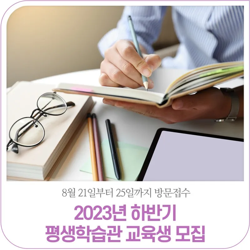 정읍시 평생학습관에서 2023년도 하반기 교육생을 모집합니다. 8월 21일(월)부터 25일(금)까지 평생학습관에 방문해 신청할 수 있습니다. 캘리그라피, 생활목공 등 다양한 교육과정이 진행되니, 많은 관심과 참여 부탁드립니다!