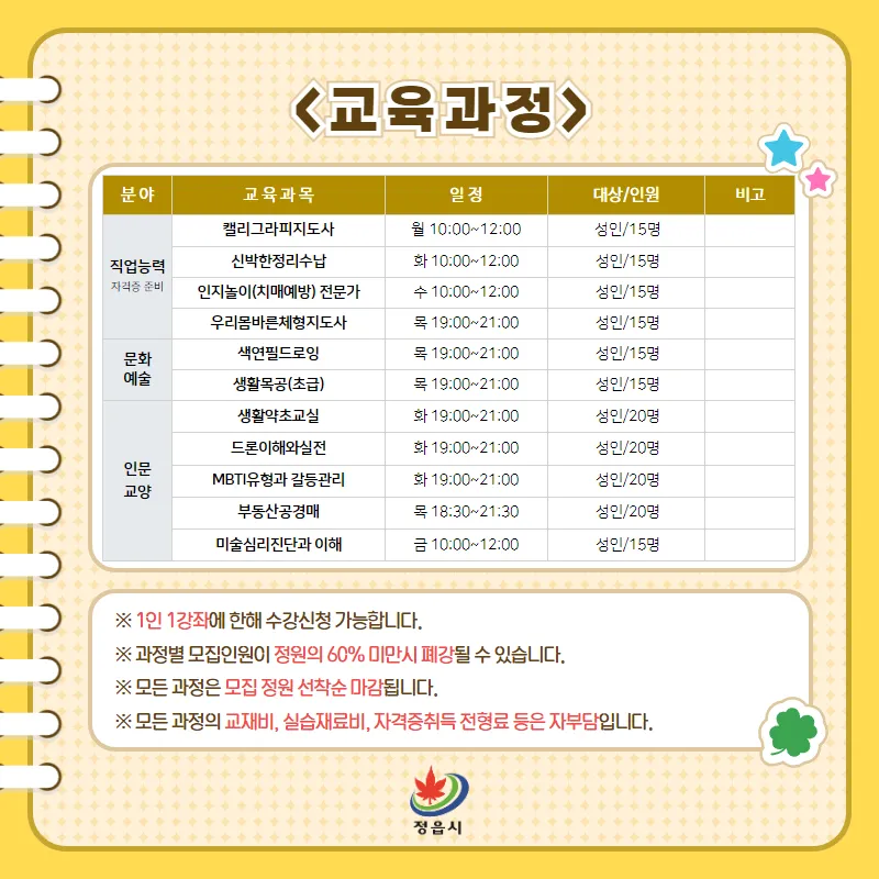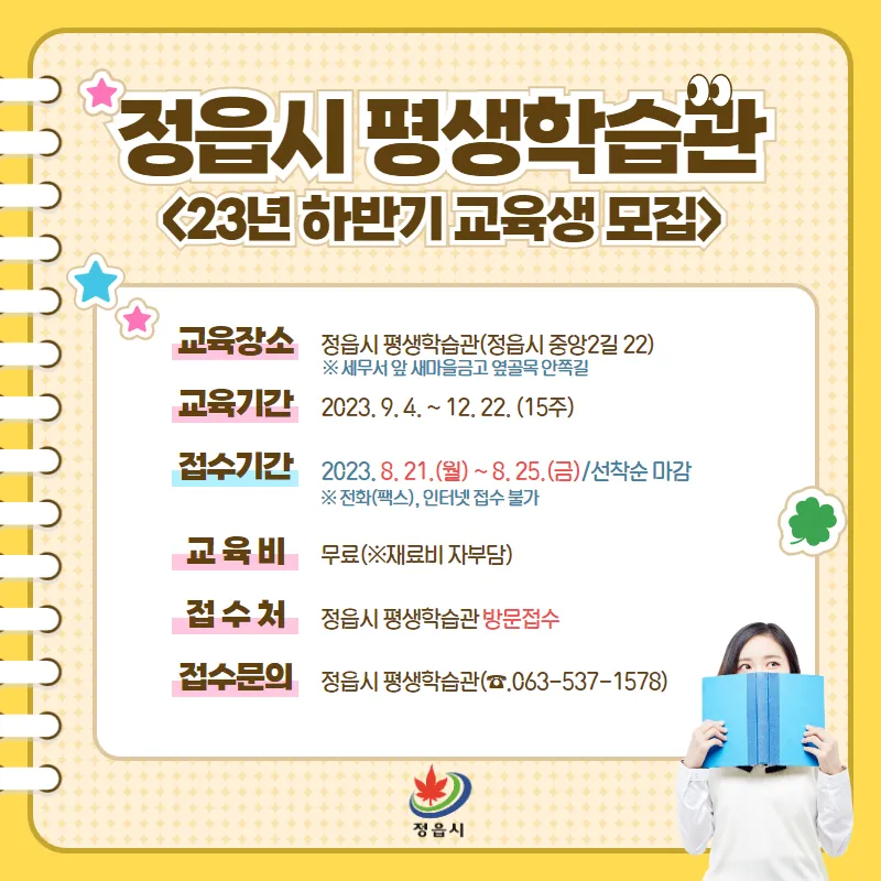 정읍시 평생학습관 2023년도 하반기 교육생 모집(8.21.~8.25. / 선착순 방문접수)