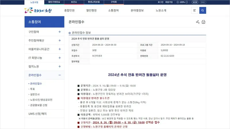 노원구청 홈페이지 > 소통참여 > 온라인접수 > 2024 추석 연휴 반려견 돌봄 쉼터 운영