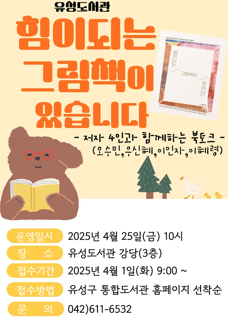 4월 1일 대전 유성도서관에서는 <힘이 되는 그림책이 있습니다> 저자 4인과 함께하는 북토크에 함께할 대전 시민분들을 모집하기 시작하였습니다. 이번 북토크는 구민을 대상으로 하는 게 아닌 대전 시민을 대상으로 모집 진행이 되며 인터넷 접수로만 접수 신청이 가능합니다.