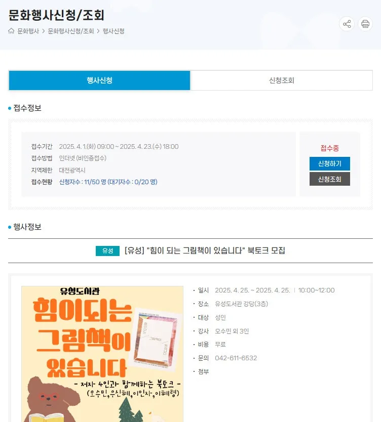 주차 공간이 넉넉한 곳은 아니기 때문에 대중교통 이용으로 방문하시는 것 또한 추천드립니다. 정류장에서 그리 멀지 않기에 도보 10분 정도면 충분히 방문이 가능합니다. 이번 북토크 신청은 유성구 통합도서관 홈페이지 문화행사 신청란에서 신청을 받고 있는데요, 대전시민 중에서도 성인을 대상으로 진행이 되어서 북토크에 관심 있는 어른들의 다양한 참여가 함께하기를 기대해 봅니다.