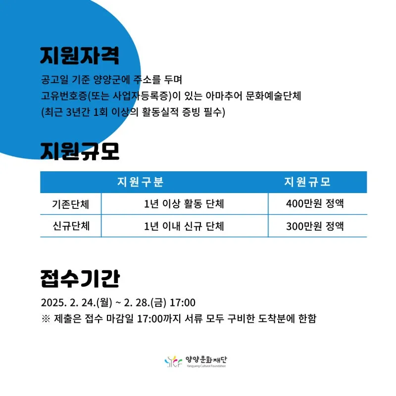 ☑ 지원분야 문학, 시각, 공연, 기타 ☑ 신청자격 공고일 기준 양양군에 주소를 두며, 고유번호증(또는 사업자등록증)을 보유한 단체(3년간 1회 이상의 활동실적 증빙 필수) ☑ 접수기간 2025. 2. 24.(월) ~ 2. 28.(금) 17:00 ☑ 접수방법 이메일 또는 방문접수 - 이메일 : kkd03076@yycf.or.kr - 접수처 : 강원 양양군 양양읍 북문길 35-21 양양문화재단 문예진흥팀 ※ 점심시간(12:00 ~ 13:00) 제외 ※ 이메일 접수 후 확인 필수 ☑ 자세한 사항은 양양문화재단 홈페이지(www.yycf.or.kr) 공지사항에서 확인하실 수 있습니다. ☑ 문의 : 양양문화재단 문예진흥팀 담당자(033-671-7806) |