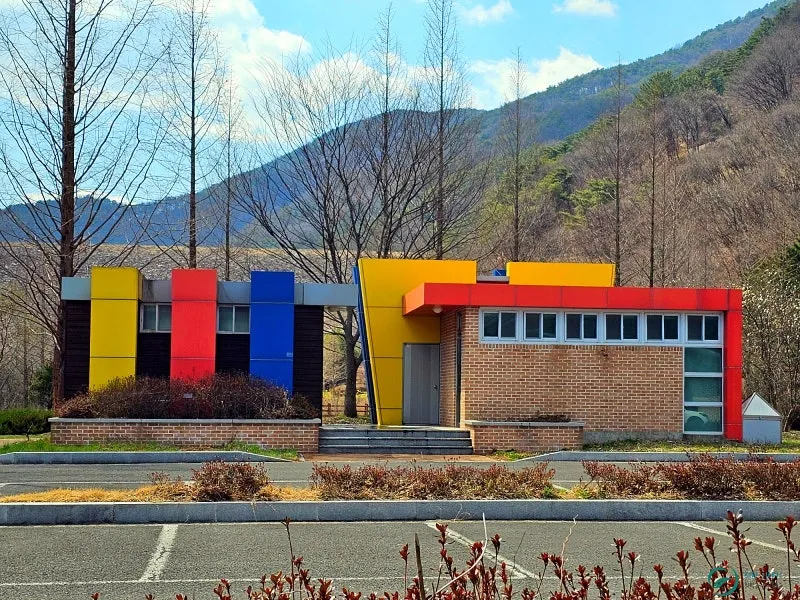 의령 벽계야영장 아래 의령예술촌주차장에 차를 세우면 바로 눈앞에 색감예쁜 화장실 건물이 또 눈에 쏙 들어옵니다.