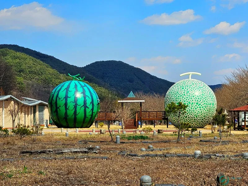커다란 수박과 멜론이 의령예술촌 정원 한가운데에 섰습니다.