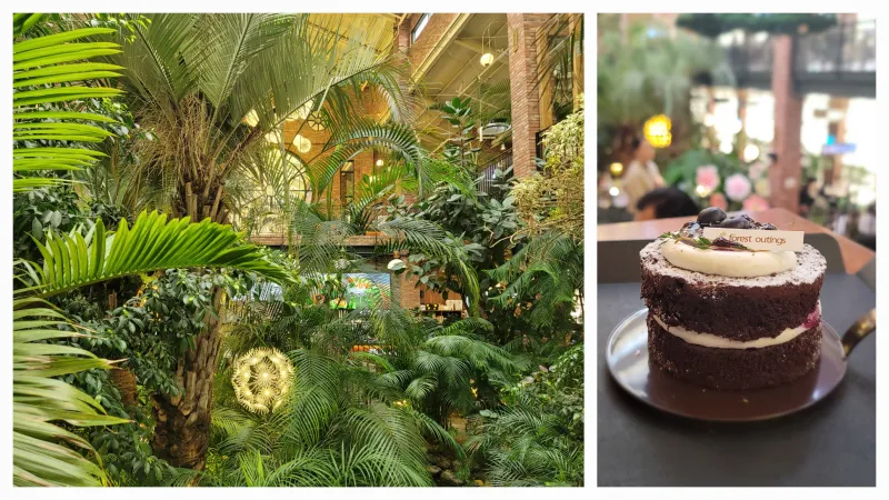 많은 식물이 있고, 천장에는 커다란 꽃이 있다.