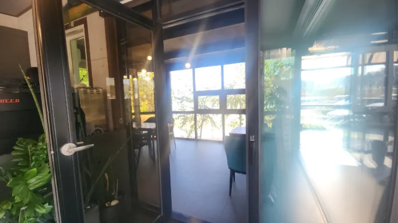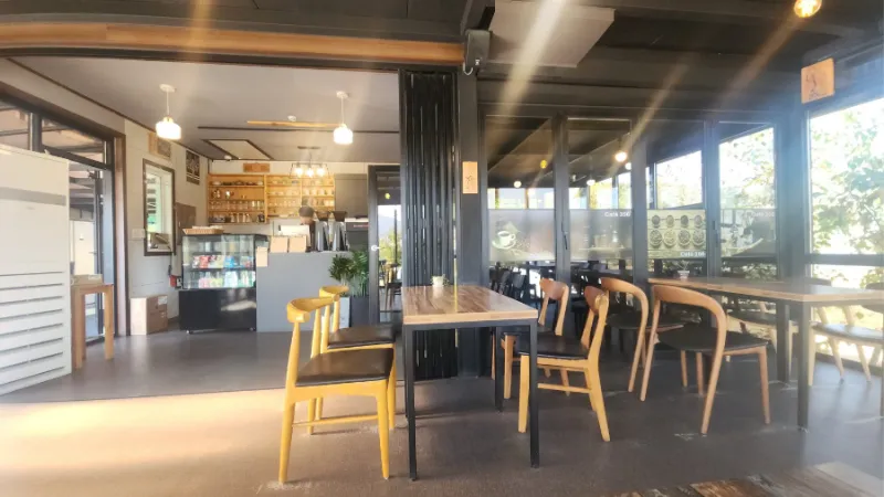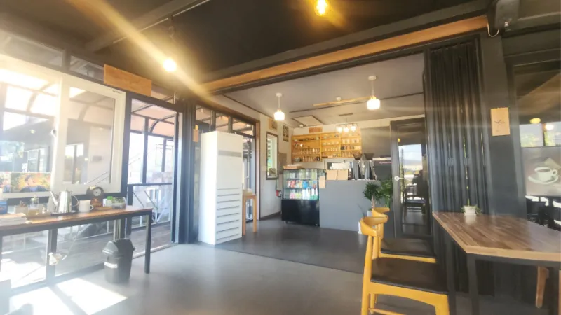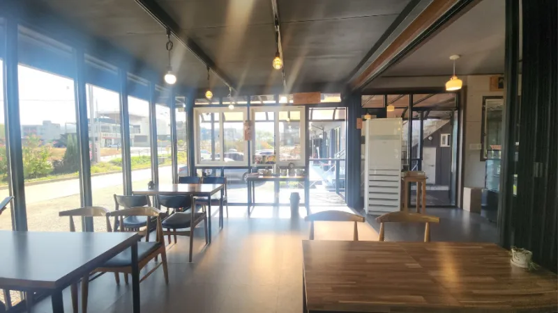 원형 로터리에서 바로 회전하면 카페로 돌아올 수 있는데요. 들어오는 입구가 잘 보이지 않아서 카페 간판을 발견하면 바로 우회전을 해서 들어오면 됩니다. 나가는 곳도 출입하는 곳이랑 같아서 운전하실 때는 항상 주의하셔야 합니다. 카페 옆에는 식당도 있습니다.