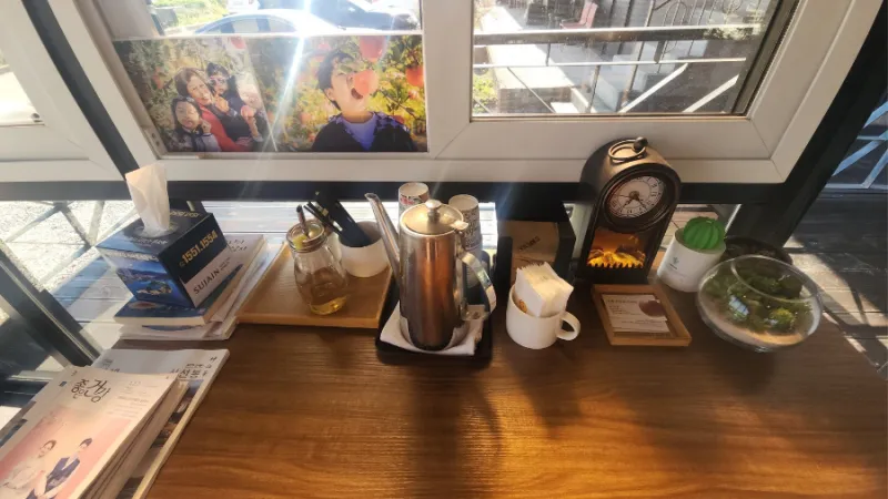 대형카페에서 제공하는 좋은 전망은 없지만, 조용히 차나 커피 한 잔을 마시면서 책을 읽고 작업하기에 좋은 곳인 거 같습니다. 설악면터미널에서 내려서 도보로 걸어오기에도 적정한 거리나 버스 시간이 남아서 커피 한 잔을 먹고 싶을 때 이용해보세요.