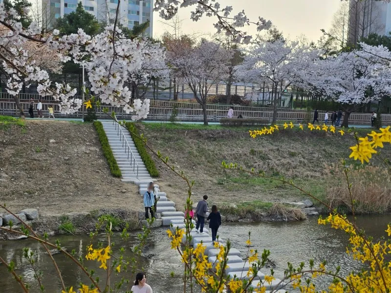 계양천을 걷다가 반대편으로 갈 수 있는 징검다리가 있어요 벚꽃 사이로 보니 아름다운 풍경 사진이 되었어요