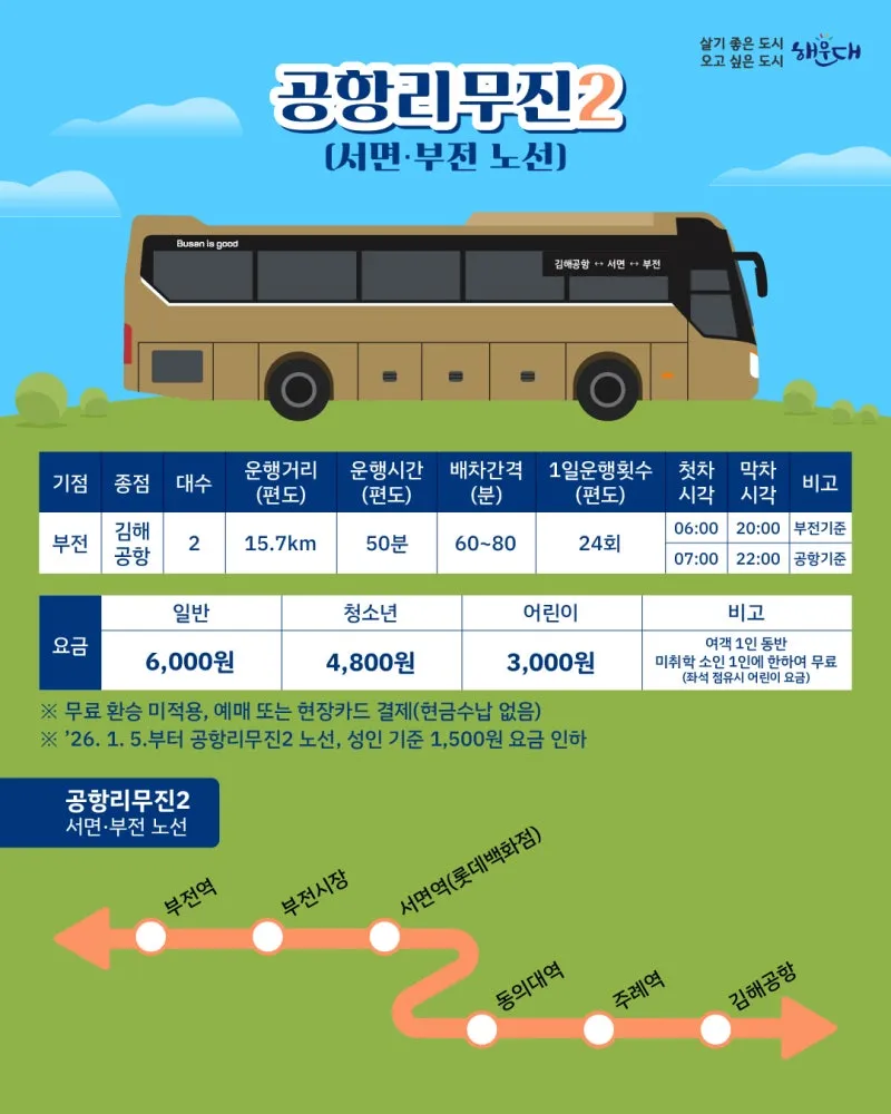 공항리무진 2(서면·부전): 성인 6,000원 / 청소년 4,800원 / 어린이 3,000원