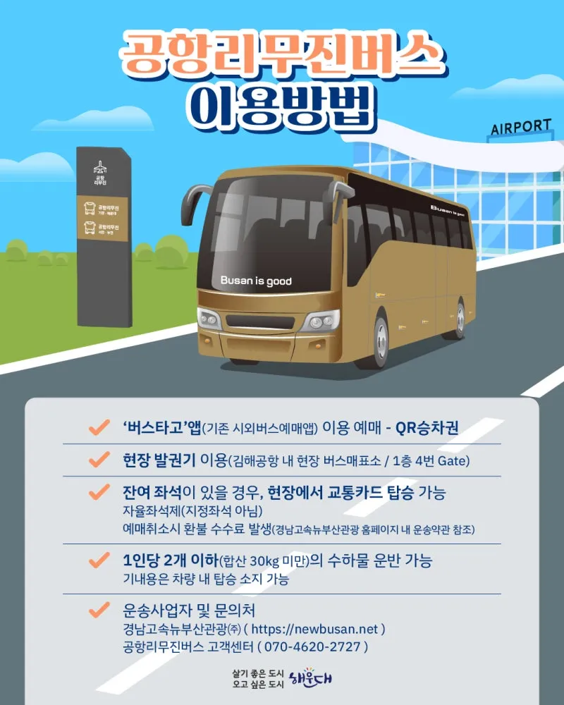 버스타고 앱 예매(QR 탑승) 또는 김해공항 1층 4번 게이트 현장 발권