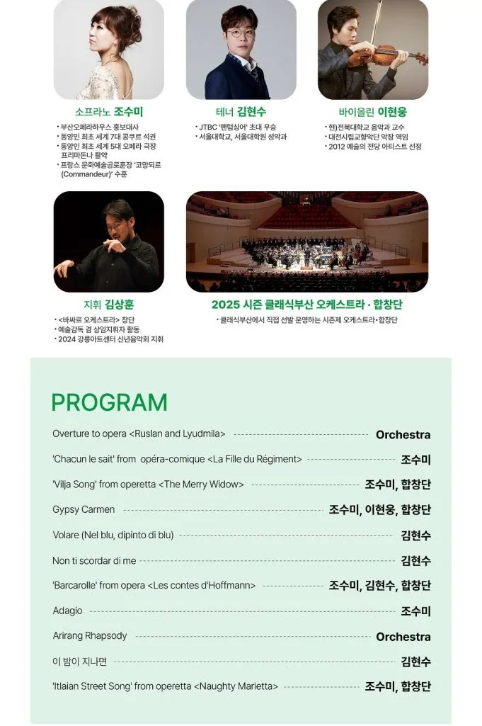 < 2025 클래식 파크 콘서트 1일차(Day1)> ․ 협연 : 소프라노 조수미, 테너 김현수, 바이올리니스트 이현웅 ․ 연주 : 2025 시즌 클래식부산 오케스트라, 합창단 ․ 지휘 : 김상훈 |