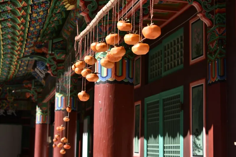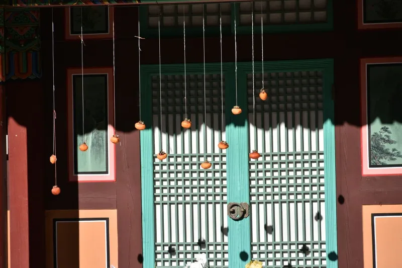 함안 장춘사를 거닐다 보면 법당 앞에 가지런히 걸려 있는 단감들이 눈길을 사로잡습니다. 오렌지빛 단감이 가지에 매달린 채 가을 햇살을 받아 반짝이는 모습은 그 자체로 소박한 예술 작품처럼 느껴집니다.