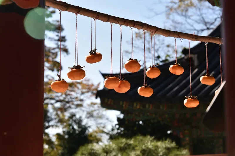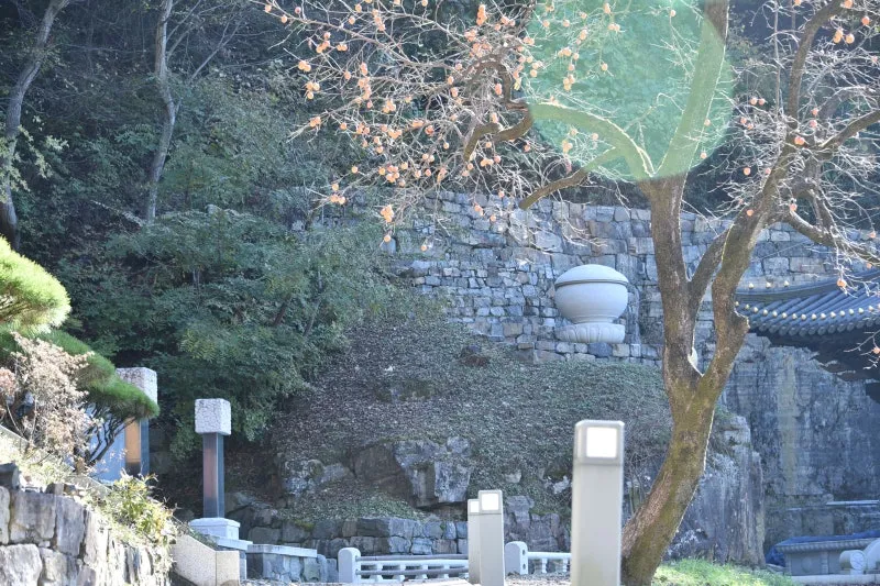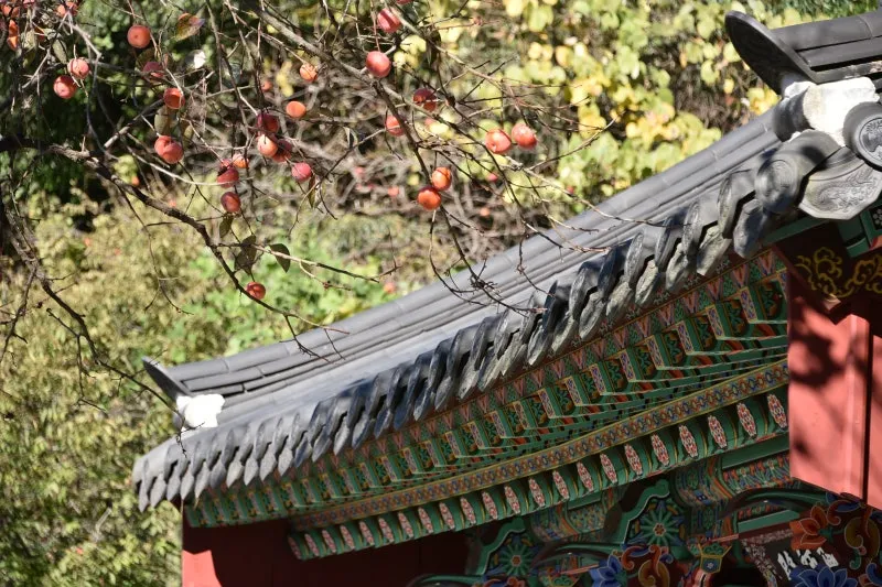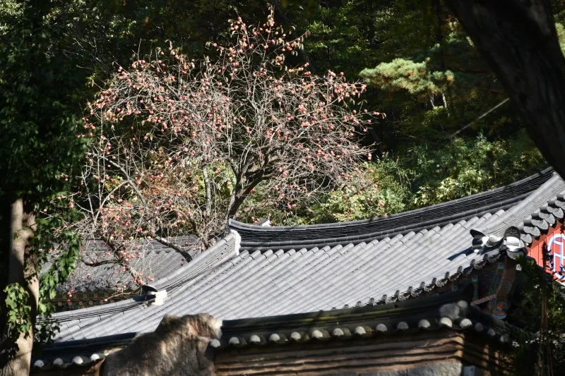특히 늦가을의 끝자락, 단감이 내뿜는 선명한 색감은 주변의 낙엽과 어우러져 고즈넉한 사찰 풍경에 생기를 불어넣습니다.