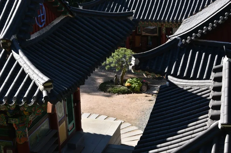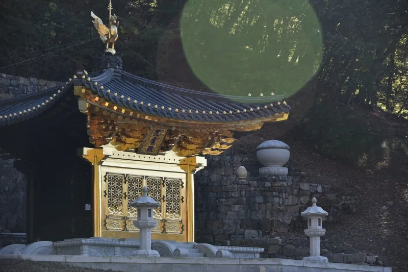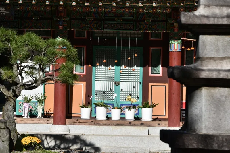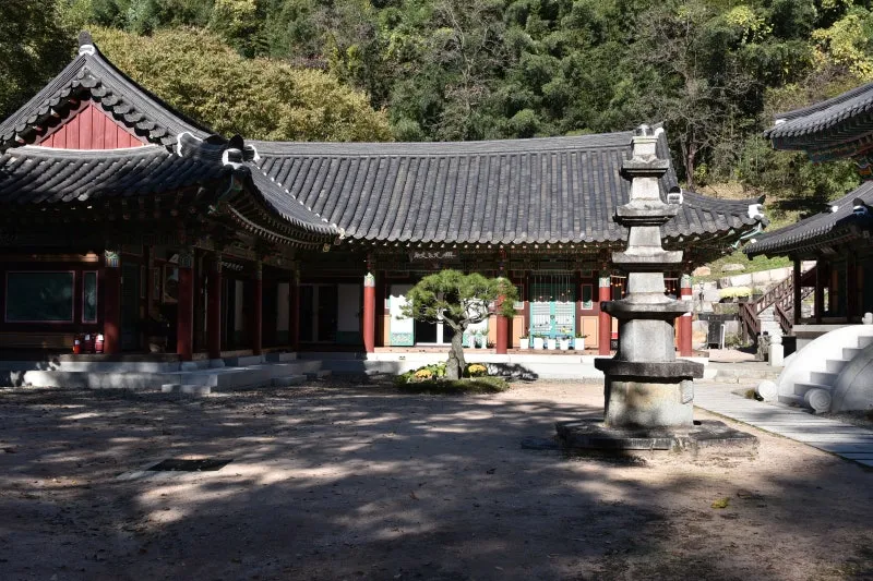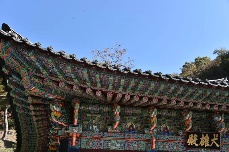 대웅전을 중심으로 오른편에는 무설전, 왼편에는 조사전이 자리하며, 각각의 건물은 단풍과 함께 조화를 이루어 고요한 늦가을의 풍경을 완성합니다.