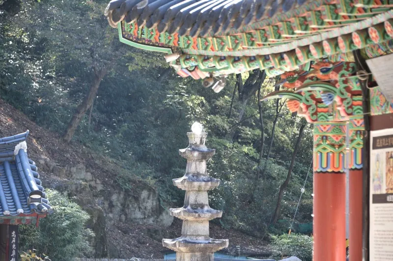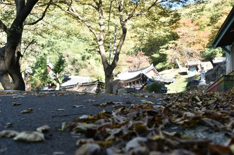 조사전 옆 계단을 오르면 약사전이 모습을 드러냅니다. 약사전 앞에는 떨어진 낙엽이 카펫처럼 깔려 있어 걷는 내내 발끝에 전해지는 부드러운 감촉이 마음을 따뜻하게 해줍니다.