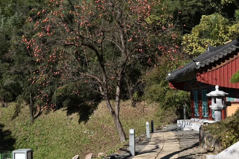 법당 앞 단감들은 마치 가을이 선물한 소박한 보물처럼 사찰에 활력을 더하며, 방문객들의 마음에도 따뜻한 여운을 남깁니다.