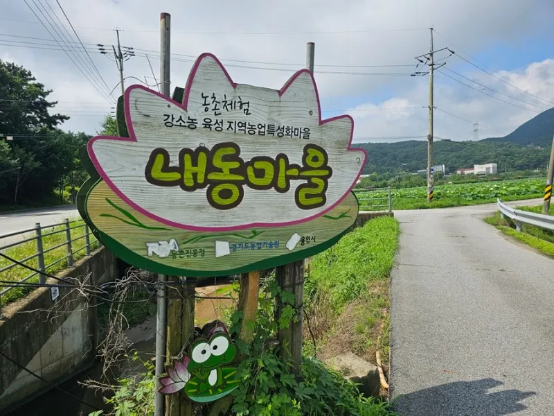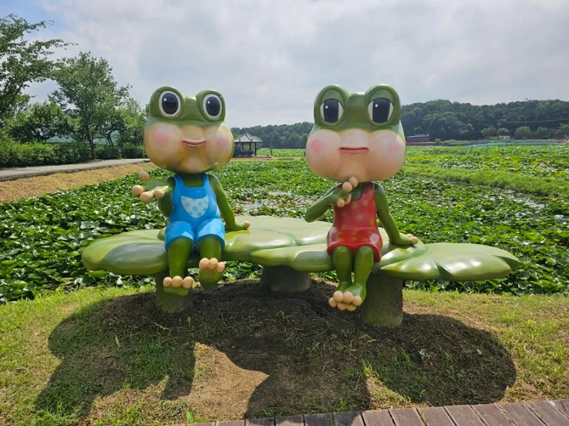 내동마을 하면 먼전 떠오르는 왕눈이에요. 아로미와 함께 연꽃마을을 지키고 있는데 이번에 갔을 때 비 내린 다음이어서인지 진짜 개구리들도 제법 퐁당퐁당 연잎 사이를 뛰어다녔습니다.