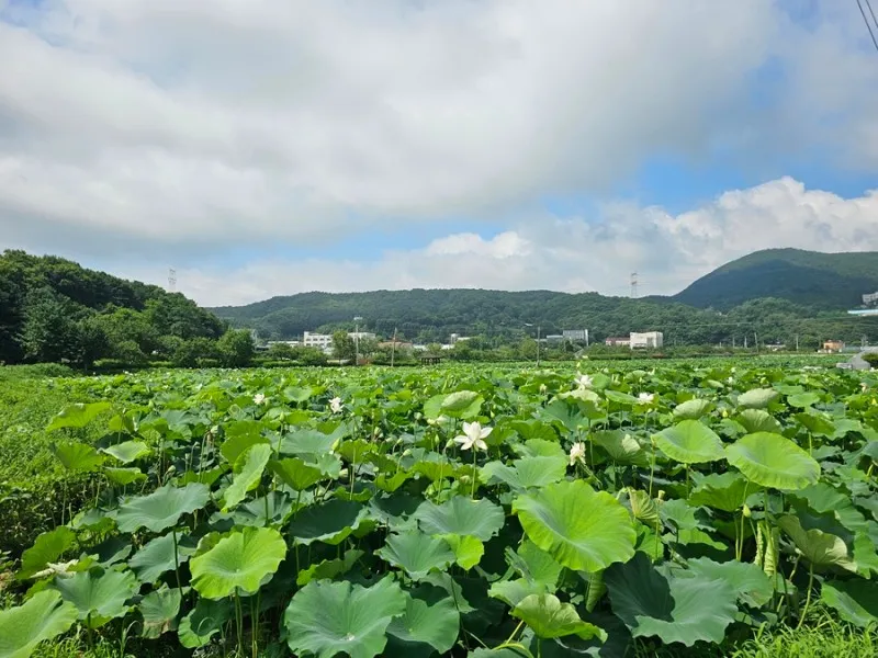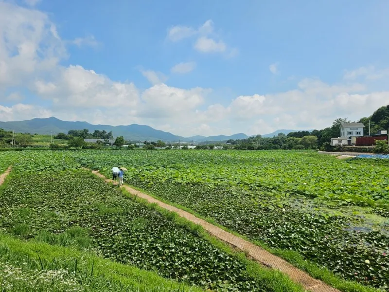 내동마을 연꽃 단지는 농촌테마파크 옆에 위치해 있어서 함께 둘러보면 좋습니다. 이 내동마을 연꽃 단지는 내동마을 주민들과 푸른 농촌 희망 찾기 프로젝트가 함께 만든 꽃밭으로 그 규모가 8.2ha 정도라고 하는데 우리가 아는 평수로 얘기하면 24,805평 정도 되는 규모입니다. 정말 광활하고 넓습니다.