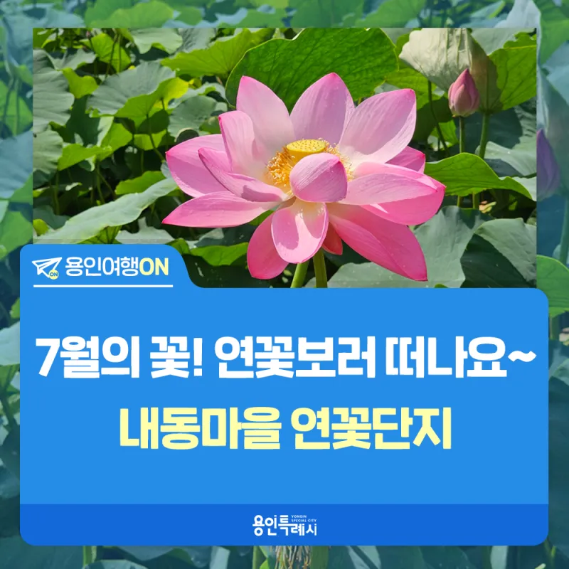 안녕하세요. 용인시 SNS 시민 서포터즈 현혜진입니다. 요즘 SNS를 보면 연꽃이 엄청 많이 올라옵니다. 7월에 피는 가장 대표적인 꽃이 연꽃이죠? 용인에서 연꽃을 즐길 수 있는 대표적인 곳이 내동마을 연꽃 단지입니다.