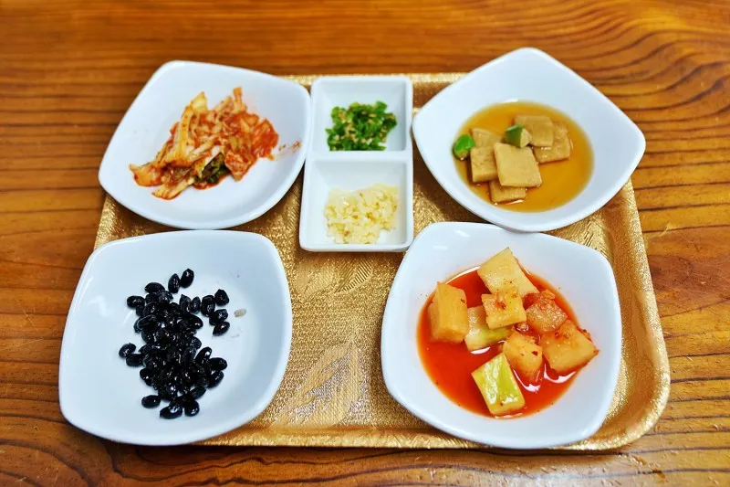 음식을 주문하니 기본적인 반찬이 쟁반에 나옵니다.