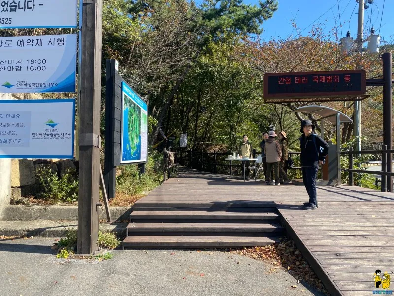 주차를 하고 등산을 시작합니다. 등산 입구에 국립공원을 관리하시는 분들이 입장할 때 이름을 적으라고 하시더라구요. 탐방로 예약제를 시행 기간이라서 예약을 하고 가야하는데 예약 미달 시에는 현장 접수를 받으신다고 하네요. 저는 예약제 시행기간인지 모르고 방문했는데 다행히 평일이라서 현장에서 바로 갈 수 있었습니다. 11월이 예약제 시행기간이었지만, 혹시 모르니 방문하실 분들은 홈페이지 한번 확인하시길 추천드려요.