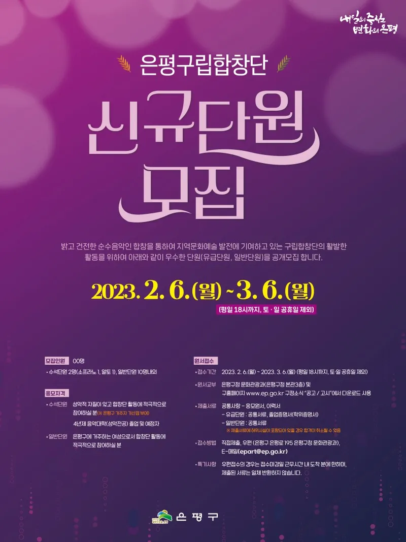 - 성악적 자질이 있고 합창단 활동에 적극적으로 참여하실 분(※ 은평구 거주자 가산점 부여)