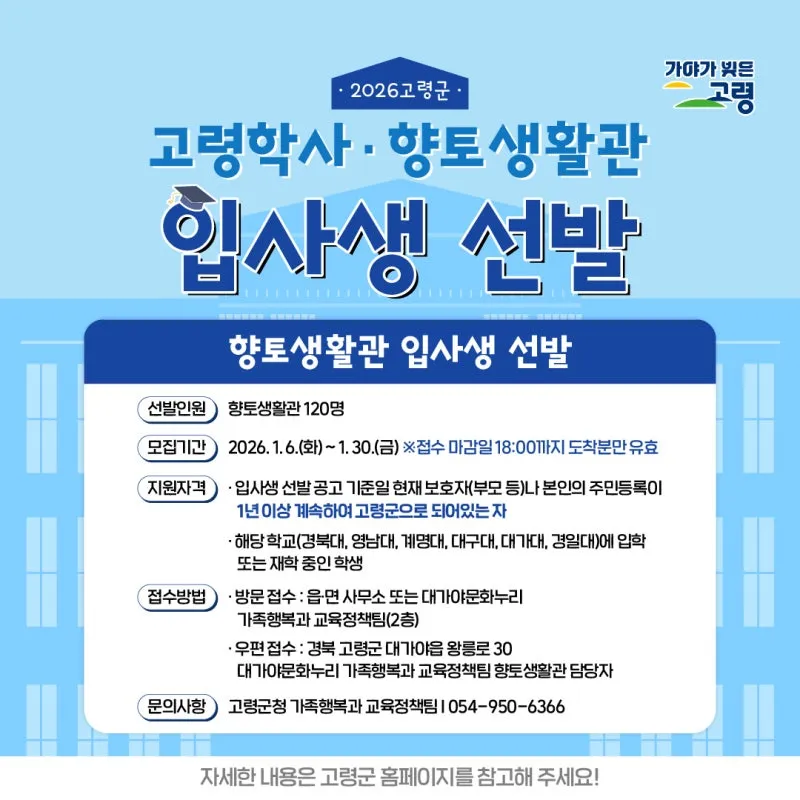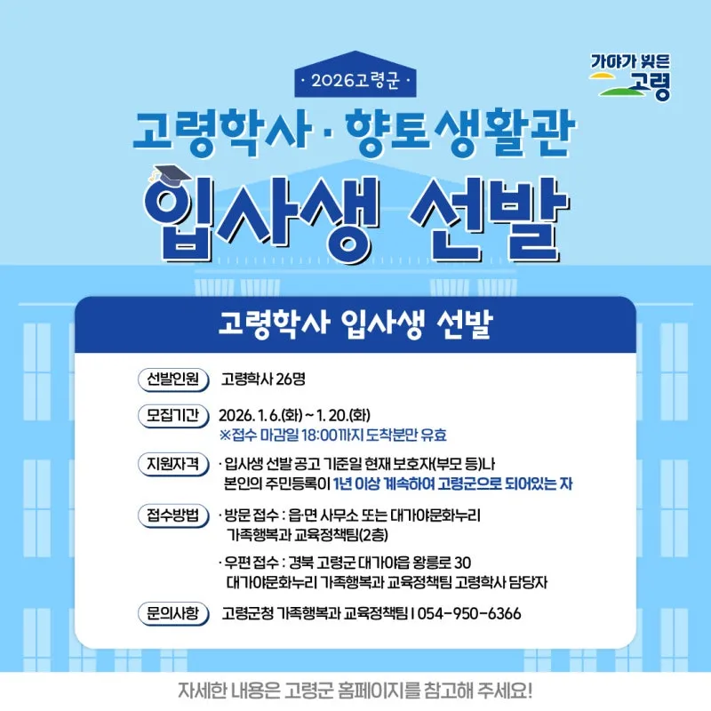 [고령 안내] 2026 고령군 고령학사·향토 생활관 입사생 선발