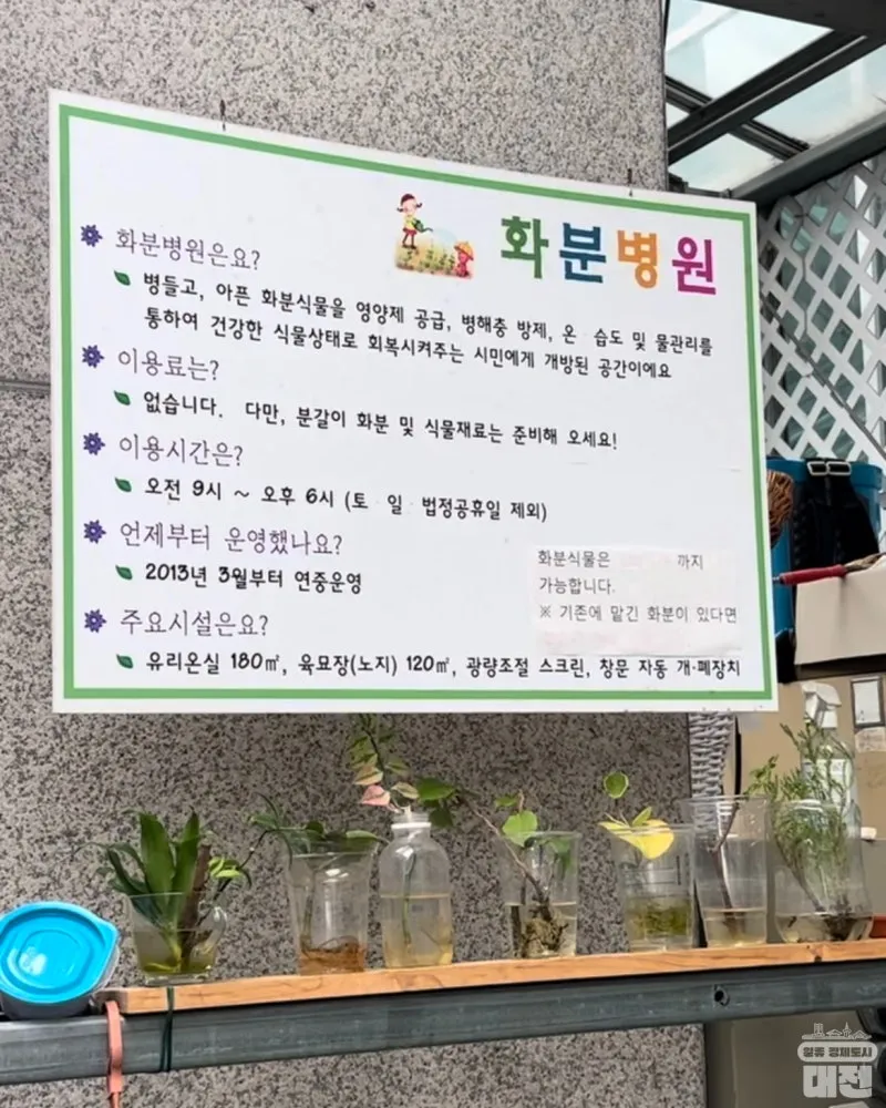 병들고 아픈 식물들을 진료해 주시고, 입원 관리가 필요한 식물들은 따로 입원까지 시켜 영양제 공급, 병충해 방제, 온 습도 관리 등을 통해 건강하게 회복시켜주는 화분병원은 대전 시민들을 위해 무료로 운영되고 있답니다.